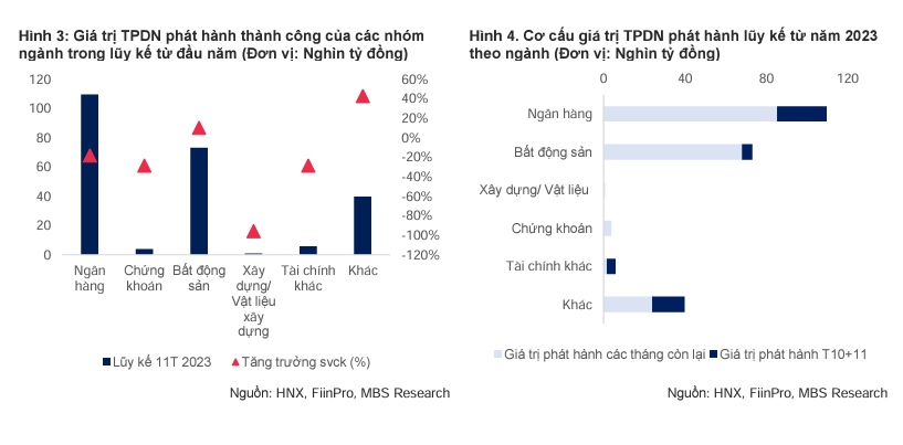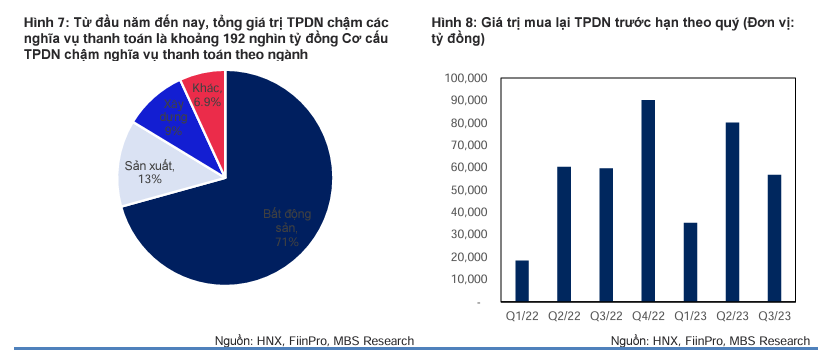 "Uớc tính tổng giá trị trái phiếu doanh nghiệp chậm các nghĩa vụ thanh toán vào khoảng 192.000 tỷ đồng, chiếm gần 19% dư nợ trái phiếu doanh nghiệp của toàn thị trường, trong đó nhóm ngành bất động sản tiếp tục chiếm tỷ trọng lớn nhất khoảng 70% giá trị chậm trả", Chứng khoán MBS nêu.