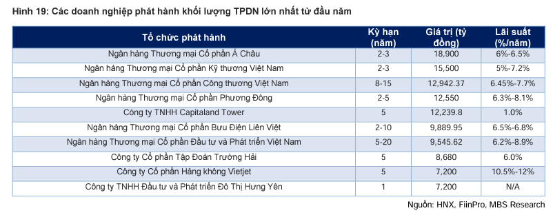 Báo cáo MBS cho thấy, năm 2023, các ngân hàng huy động trái phiếu nhiều nhất gồm: ACB (18.900 tỷ đồng), Techcombank (15.500 tỷ đồng), Vietinbank (12.900 tỷ đồng), LPBank (9.890 tỷ đồng), BIDV (9.545 tỷ đồng)…