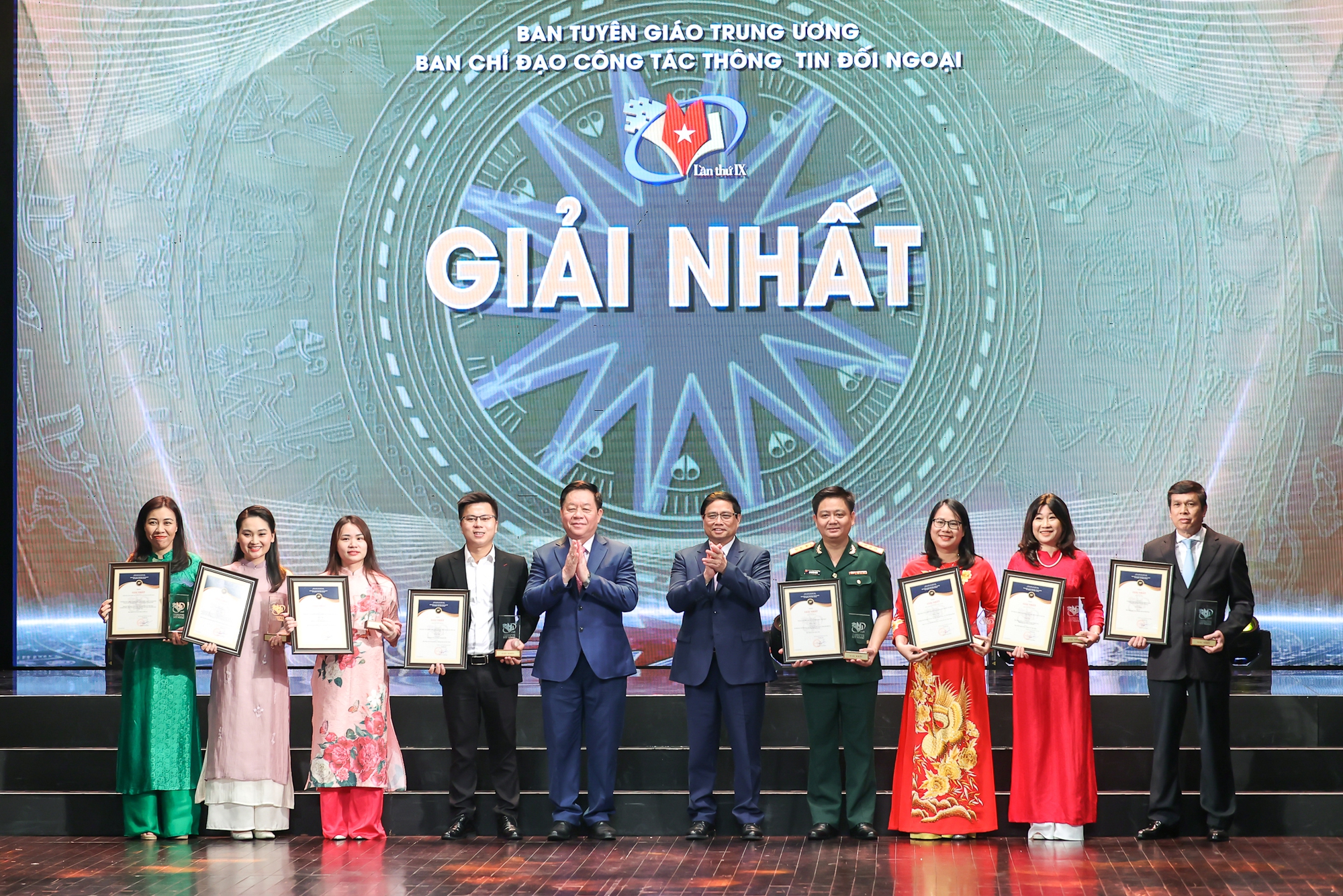 Thủ tướng Phạm Minh Chính và đồng chí Nguyễn Trọng Nghĩa, Bí thư Trung ương Đảng, Trưởng Ban Tuyên giáo Trung ương, Trưởng Ban Chỉ đạo Công tác thông tin đối ngoại trao giải Nhất cho các tác giả, nhóm tác giả.