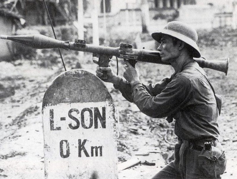 Hình ảnh người chiến sĩ cầm súng B41 hướng về phía quân xâm lược, bên cạnh là cột mốc số 0 Lạng Sơn, rạng sáng 17/2/1979 mang tính biểu tượng về cuộc chiến đấu bảo vệ biên giới phía bắc năm 1979. (Ảnh: Tư liệu/TTXVN phát)