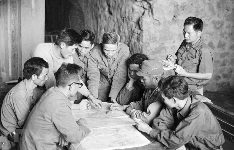 Bộ Chỉ huy mặt trận Lạng Sơn cùng chỉ huy Đoàn 327 bàn phương án tác chiến tại hang Chùa Tiên, thị xã Lạng Sơn. (Ảnh: Văn Bảo/TTXVN)