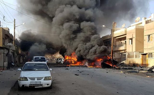 Khói bốc lên từ những xe ô tô bị cháy sau vụ nổ ở thành phố Qamishli, đông bắc Syria