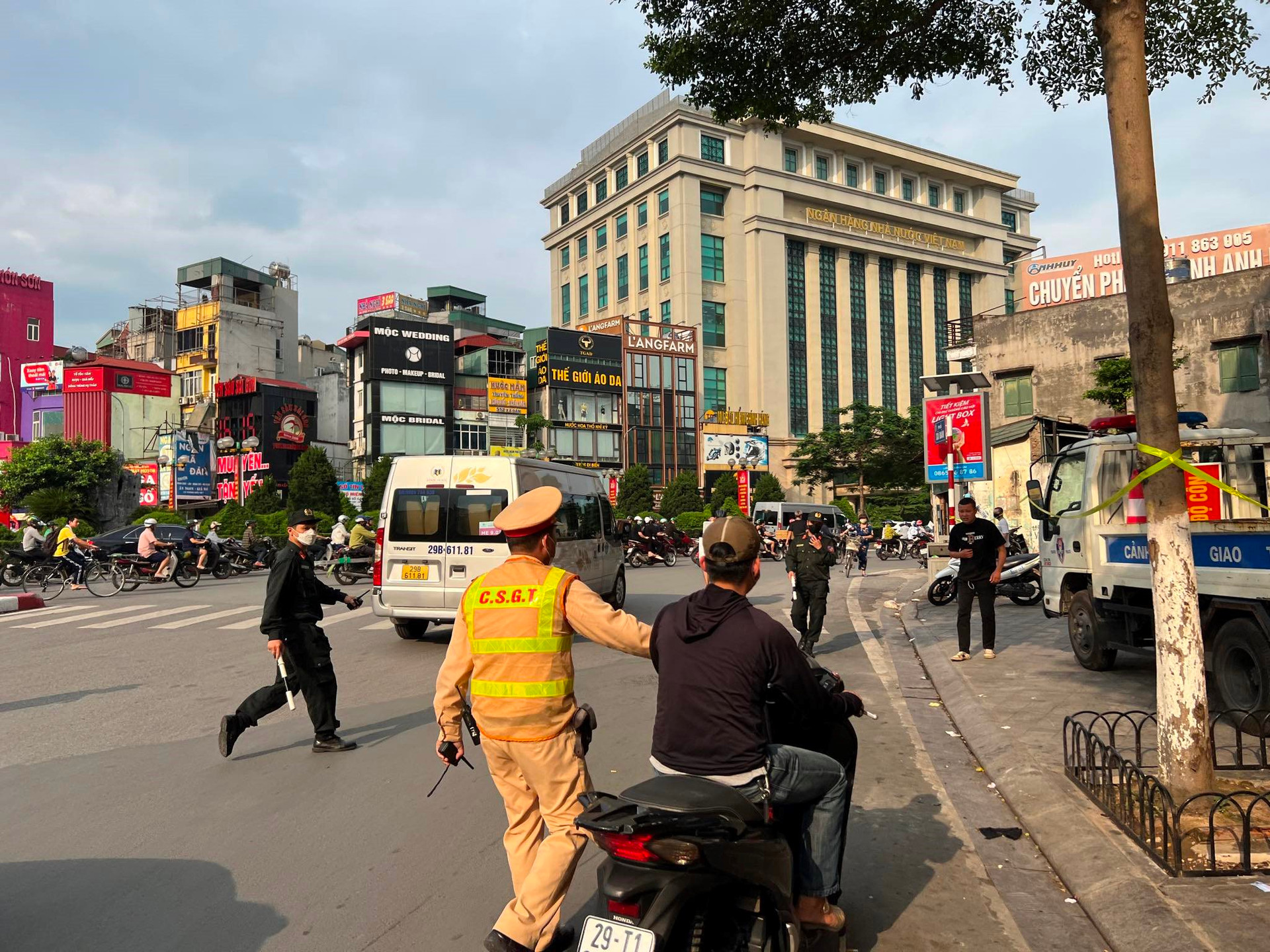 Ghi nhận trong chiều 16/5, tại nút giao thông Ô Chợ Dừa (quận Đống Đa, Hà Nội), đồng loạt 5 tổ công tác phối hợp cùng Đội Cảnh sát giao thông số 3 - Phòng Cảnh sát giao thông, Công an quận Đống Đa đã triển khai kế hoạch theo 5 hướng đi qua nút giao thông từ Nguyễn Lương Bằng, Xã Đàn, Khâm Thiên, Tôn Đức Thắng và hướng từ hầm chui Kim Liên.