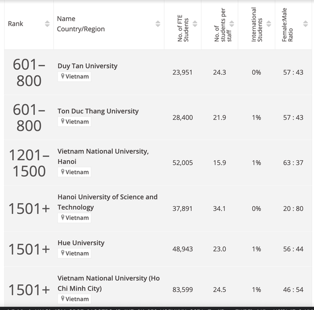 Việt Nam tiếp tục có 6 đại diện được xếp hạng, đó là ĐHQG Hà Nội, ĐHQG TPHCM, ĐH Bách khoa Hà Nội, ĐH Huế, Trường ĐH Duy Tân và Trường ĐH Tôn Đức Thắng.
