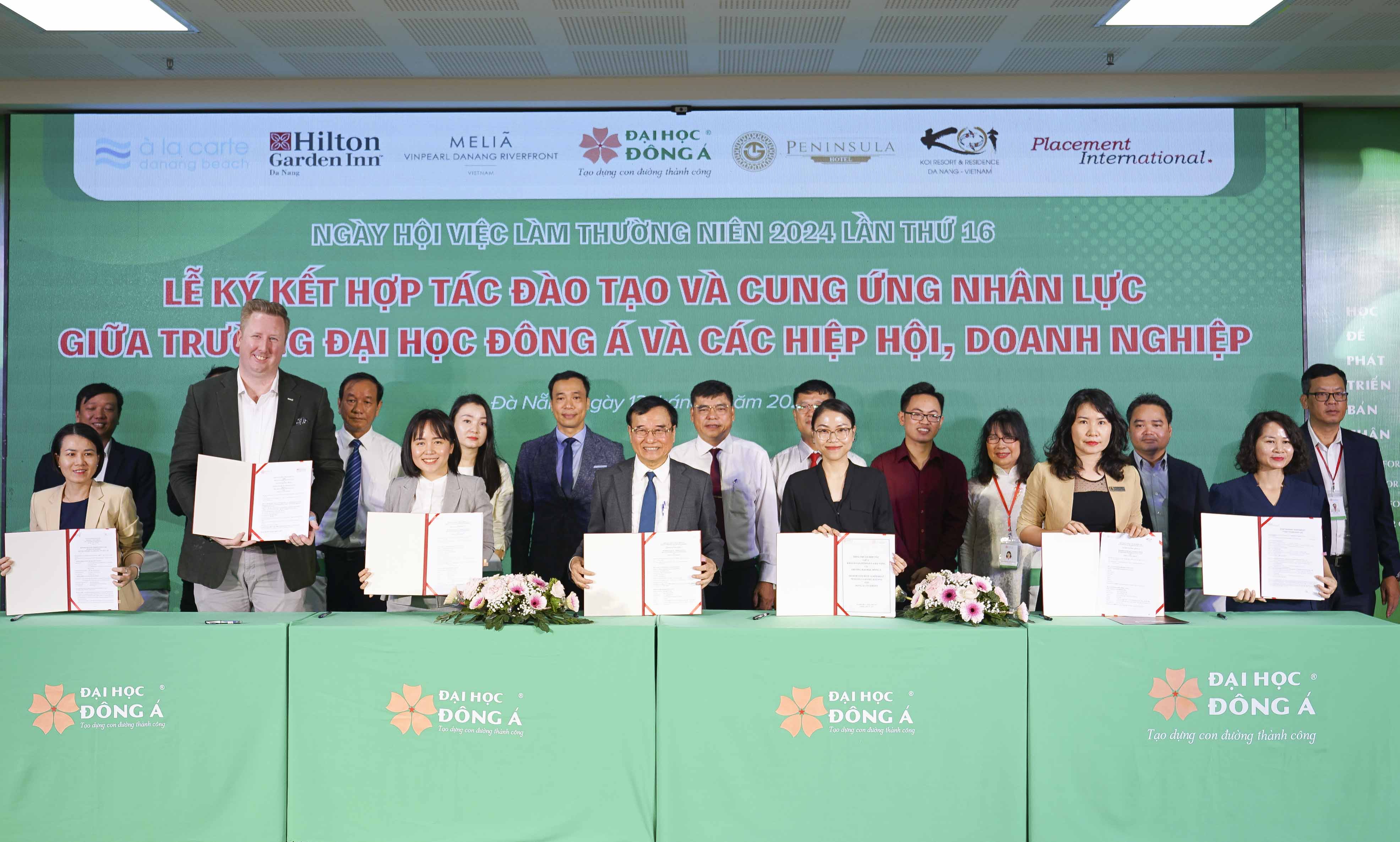 Tại phiên khai mạc Ngày hội việc làm 2024, Đại học Đông Á cũng ký kết thêm 12 văn bản hợp tác với các đối tác doanh nghiệp, hiệp hội tham gia vào chương trình hợp tác đào tạo và cung ứng nhân sự các ngành làm việc trong các lĩnh vực kinh tế - du lịch, kỹ thuật – công nghệ, ngôn ngữ,…
