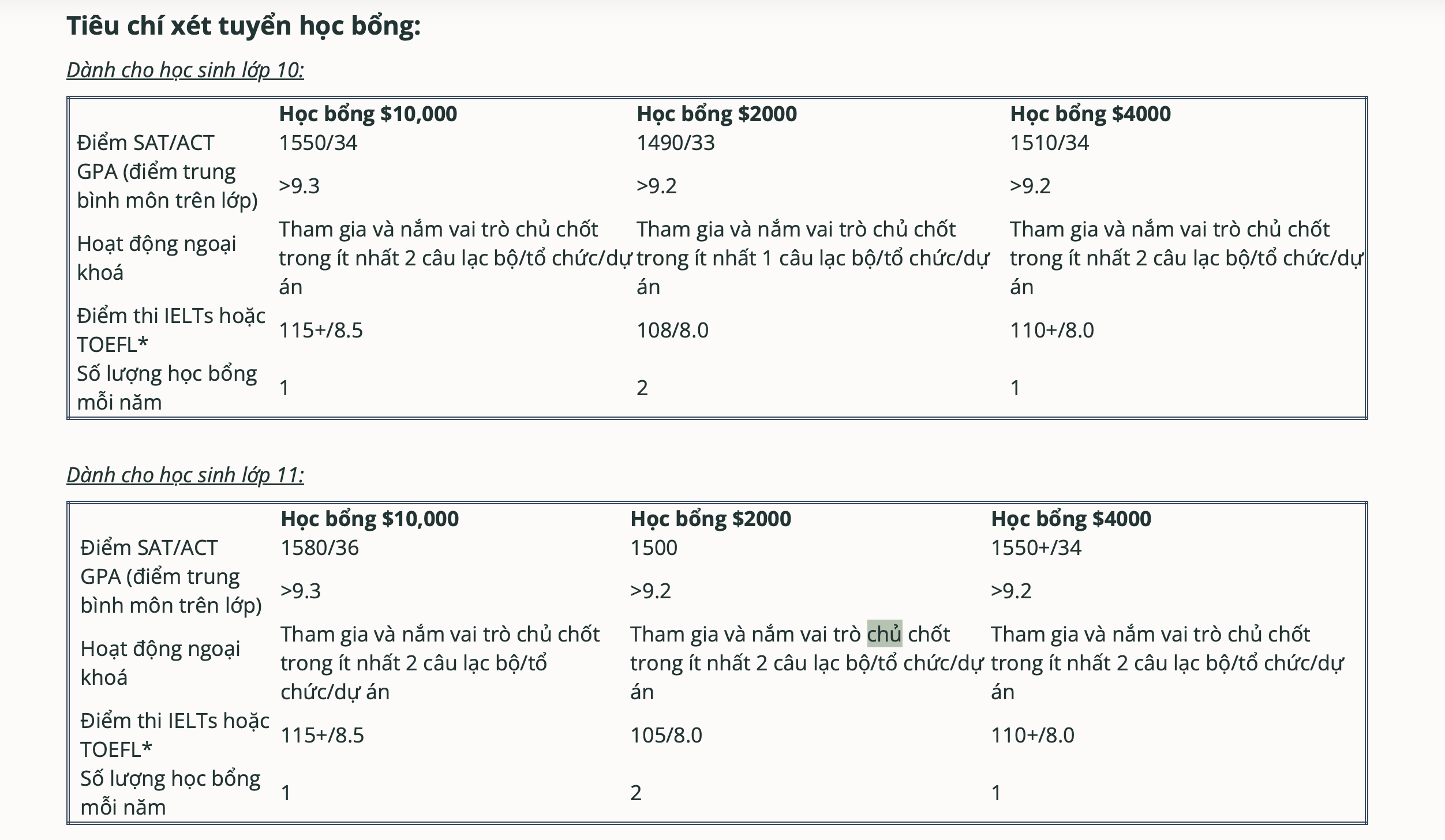- Học bổng dành cho học sinh lớp 10 và 11 đang theo học tại các trường THPT tại Việt Nam đáp ứng tiêu chí học bổng