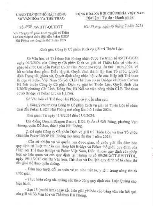 Trước đó tháng 9/2024, SỞ VHTTDL Hải Phòng cấp phép tổ chức 1 giải POKER USOP lần 1