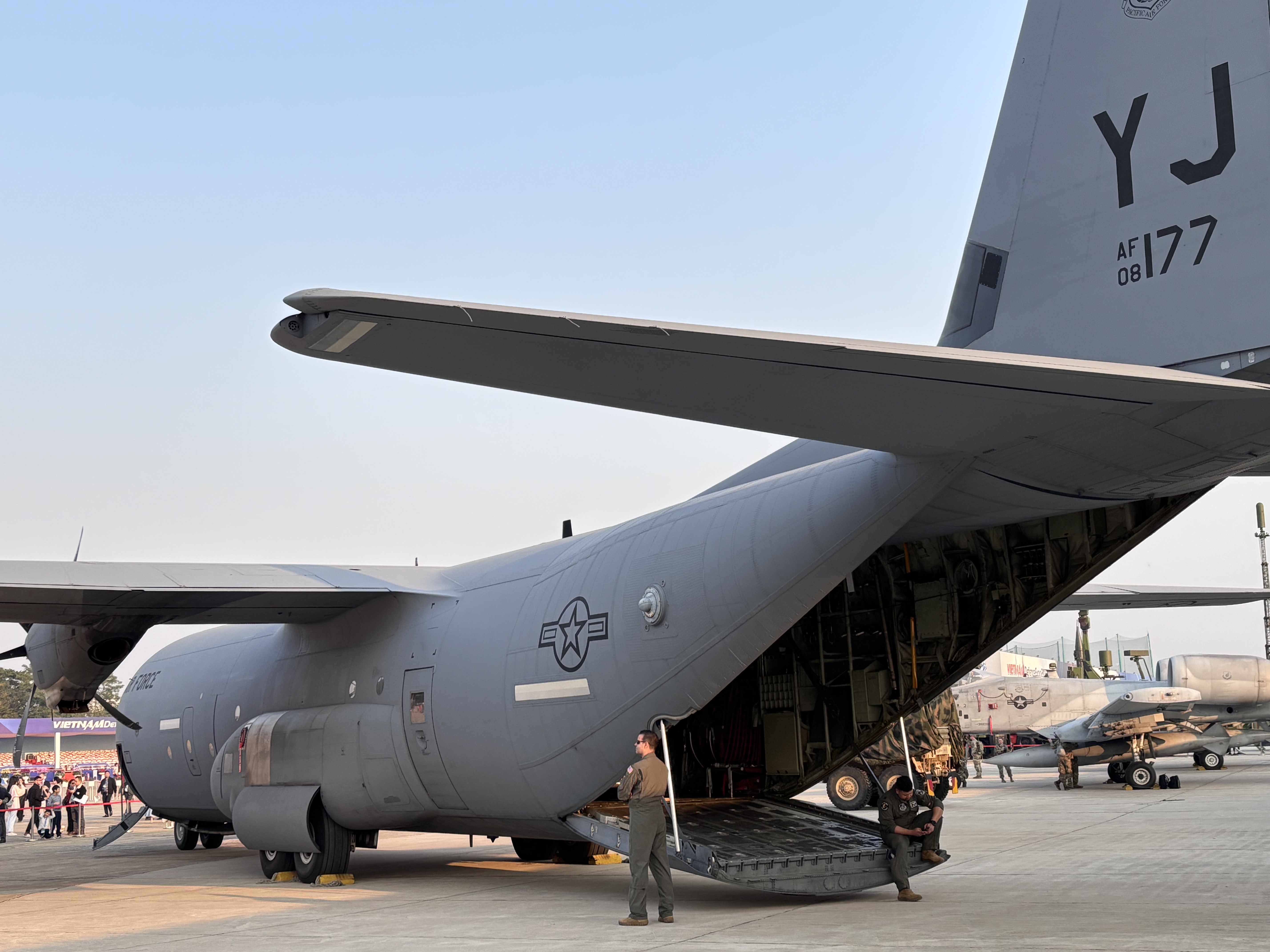 Máy bay C-130J Super Hercules, một trong những biểu tượng của ngành hàng không vận tải quân sự Mỹ, được biết đến với khả năng hoạt động đa nhiệm và bền bỉ đang được trưng bày tại Triển lãm Quốc phòng quốc tế Việt Nam 2024