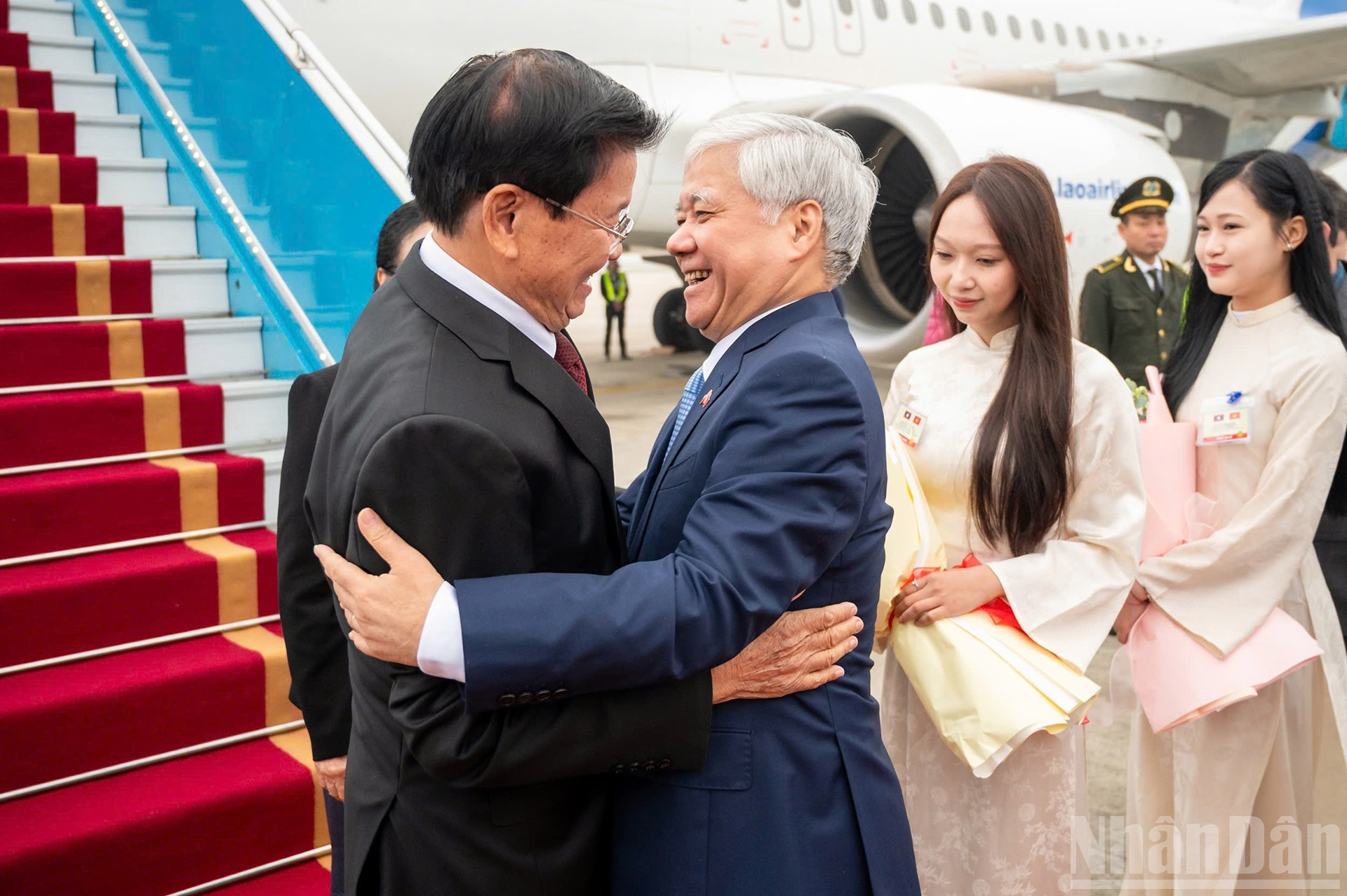Các đại biểu Việt Nam đón Tổng Bí thư Ban Chấp hành Trung ương Đảng Nhân dân cách mạng Lào, Chủ tịch nước Cộng hòa Dân chủ Nhân dân Lào Thongloun Sisoulith.