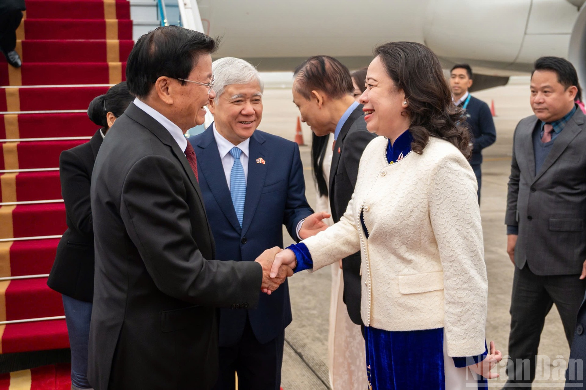 Phó Chủ tịch Thường trực Quốc hội Đỗ Văn Chiến và Phó Chủ tịch nước Võ Thị Ánh Xuân đón Tổng Bí thư Ban Chấp hành Trung ương Đảng Nhân dân cách mạng Lào, Chủ tịch nước Cộng hòa Dân chủ Nhân dân Lào Thongloun Sisoulith tại sân bay quốc tế Nội Bài.