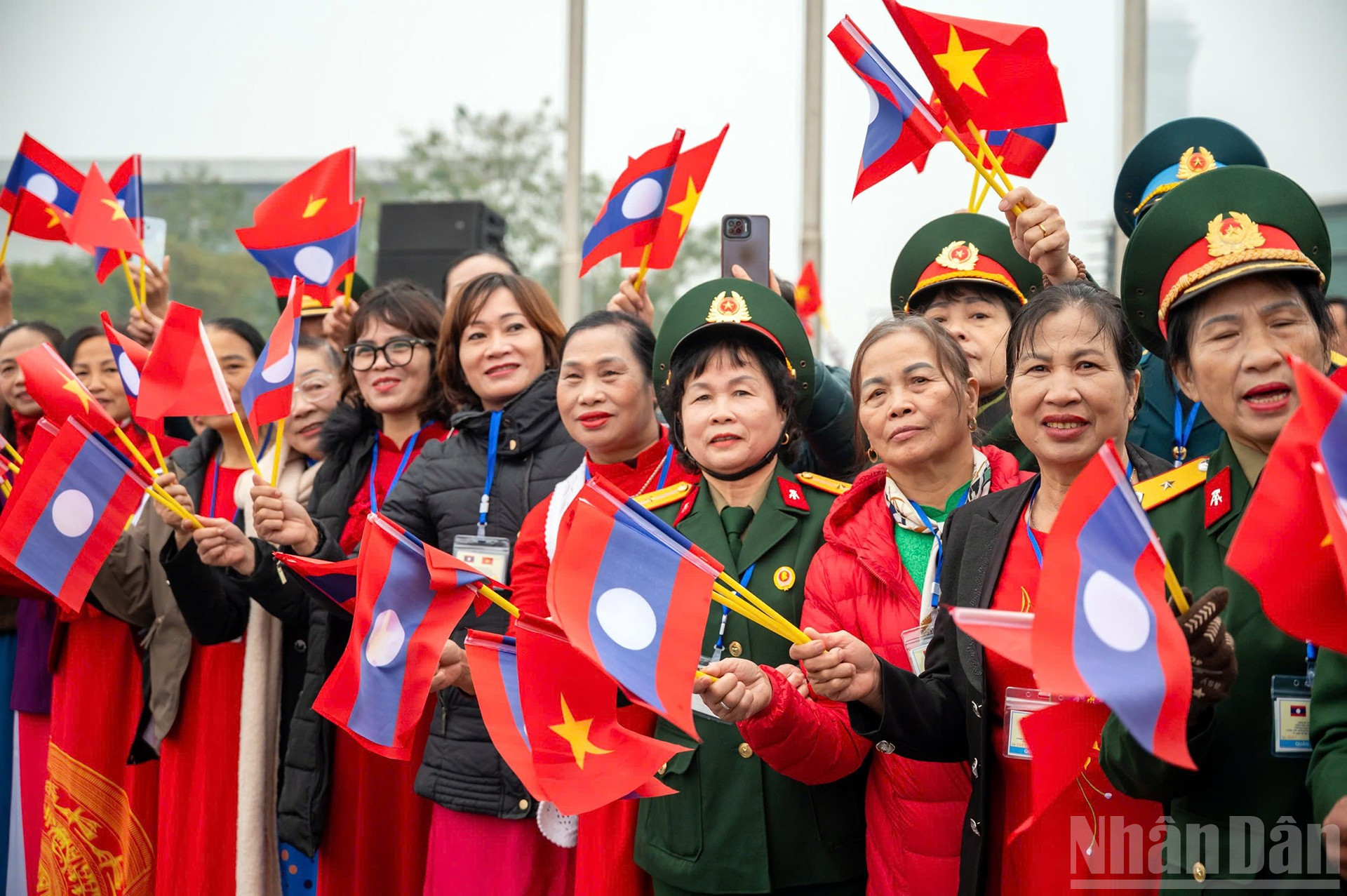 Các cựu chiến binh và nhân dân thủ đô đón chào Tổng Bí thư Ban Chấp hành Trung ương Đảng Nhân dân cách mạng Lào, Chủ tịch nước Cộng hòa Dân chủ Nhân dân Lào Thongloun Sisoulith và Phu nhân.