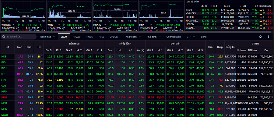 Chốt phiên giao dịch ngày 11/3, sàn HOSE có 297 mã tăng và 165 mã giảm, VN-Index tăng 11,65 điểm (+1,00%), lên 1.181,73 điểm. Tổng khối lượng giao dịch đạt hơn 629,1 triệu đơn vị, giá trị 15.111 tỷ đồng, giảm 13% về khối lượng và 16% về giá trị so với phiên 10/3.