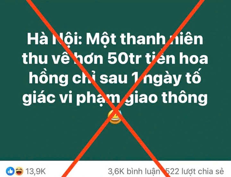 TCVM - Phòng Cảnh sát giao thông (Công an TP. Hà Nội) cho biết một số trang mạng xã hội đưa thông tin "Hà Nội: Một thanh niên thu về 50 triệu đồng chỉ sau 1 ngày tố giác vi phạm giao thông" là không đúng sự thật.