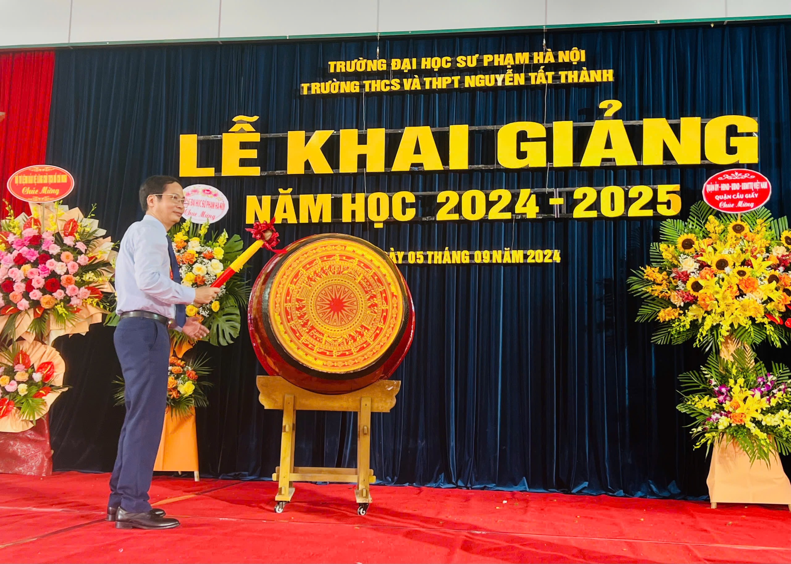 Hiệu trưởng đánh trống khai giảng năm học mới tại trường Trường THCS và THPT Nguyễn Tất Thành