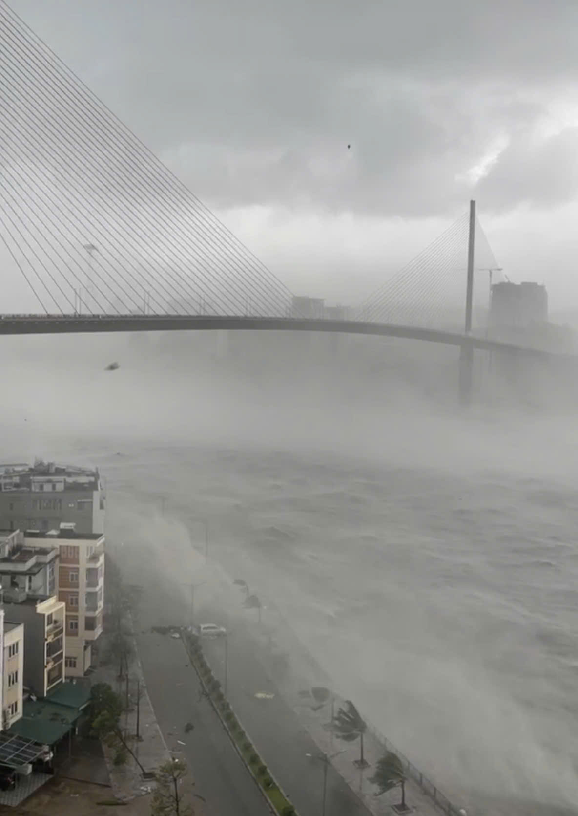 Cầu Bãi Cháy TP Hạ Long oằn mình chống chọi trong cơn bão (Ảnh chụp màn hình người dân chia sẻ)