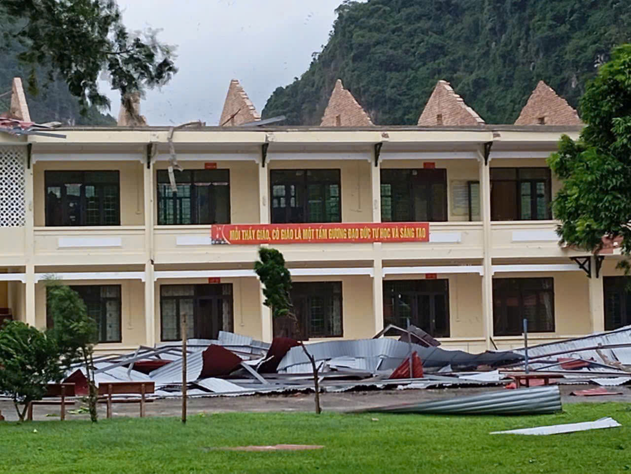 Bão cuốn bay mái tôn tại trường Trung học cơ sở Võ Nhai tỉnh Thái Nguyên (Ảnh người dân cung cấp)