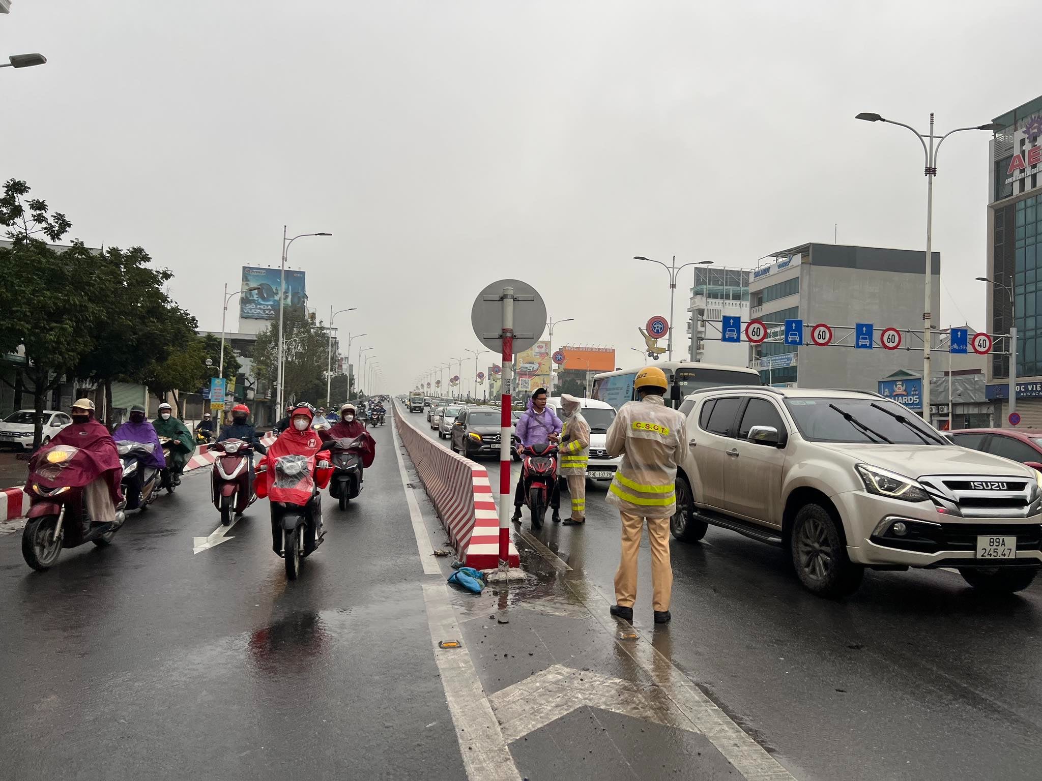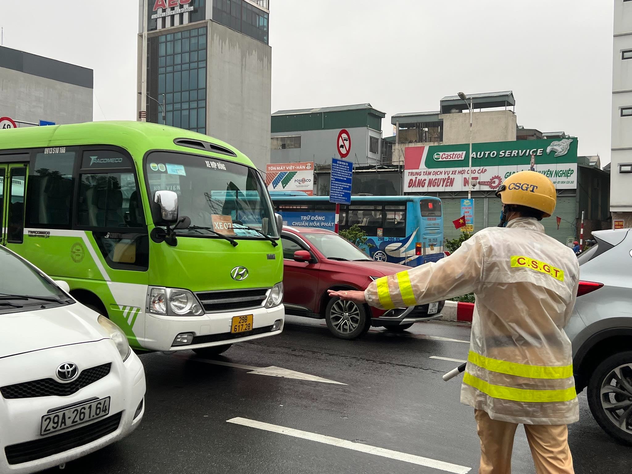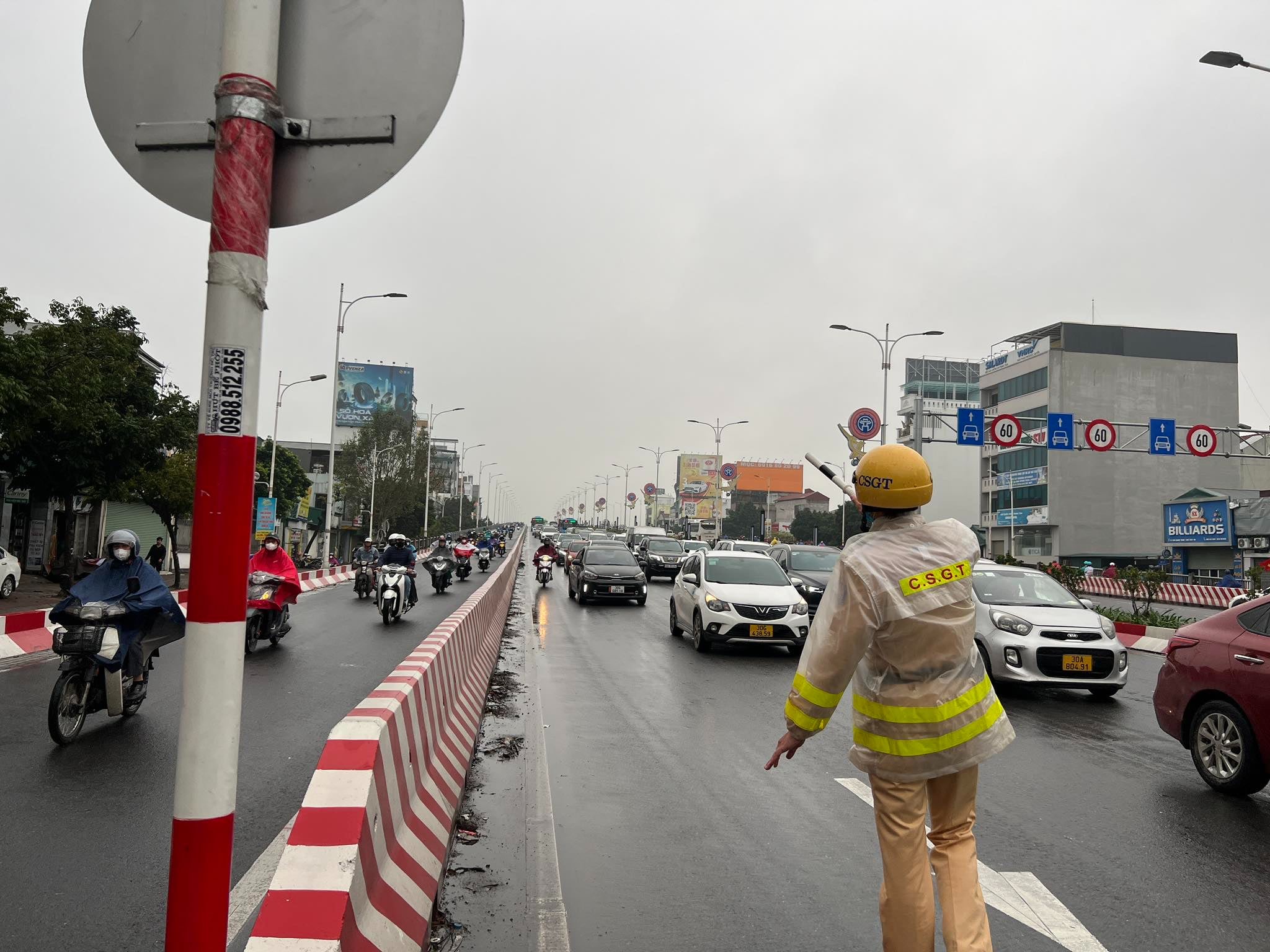 Ghi nhận, tại khu vực phía Nam cầu Vĩnh Tuy, quận Hai Bà Trưng từ 6h sáng ngày 15/3 thời tiết có mưa vừa và lớn, Đại uý Nguyễn Ngọc Tú, cán bộ Đội Cảnh sát giao thông số 4, (Phòng Cảnh sát giao thông) đã ứng trực khu vực đặt biển phân làn phân định rõ làn ô tô, làn xe máy.