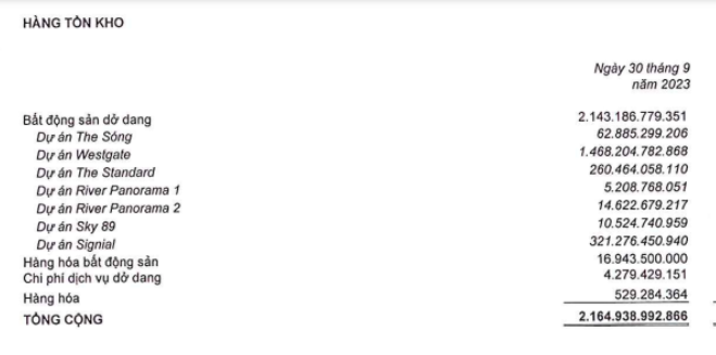 Đến cuối tháng 9/2023, An Gia ghi nhận giá trị hàng tồn kho 2.165 tỷ đồng