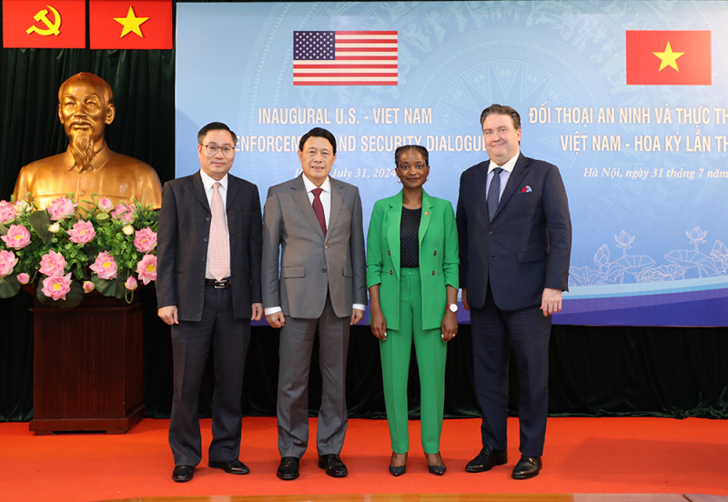 Trung tướng Lê Quốc Hùng, Ủy viên Trung ương Đảng, Thứ trưởng Bộ Công an cùng Quyền Trợ lý Ngoại trưởng Hoa Kỳ Shelby Smith-Wilson và Đại sứ Hoa Kỳ tại Việt Nam Marc Knapper đồng chủ trì Đối thoại.
