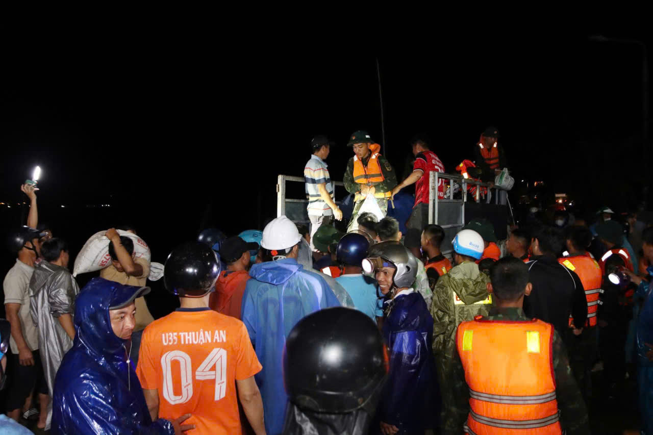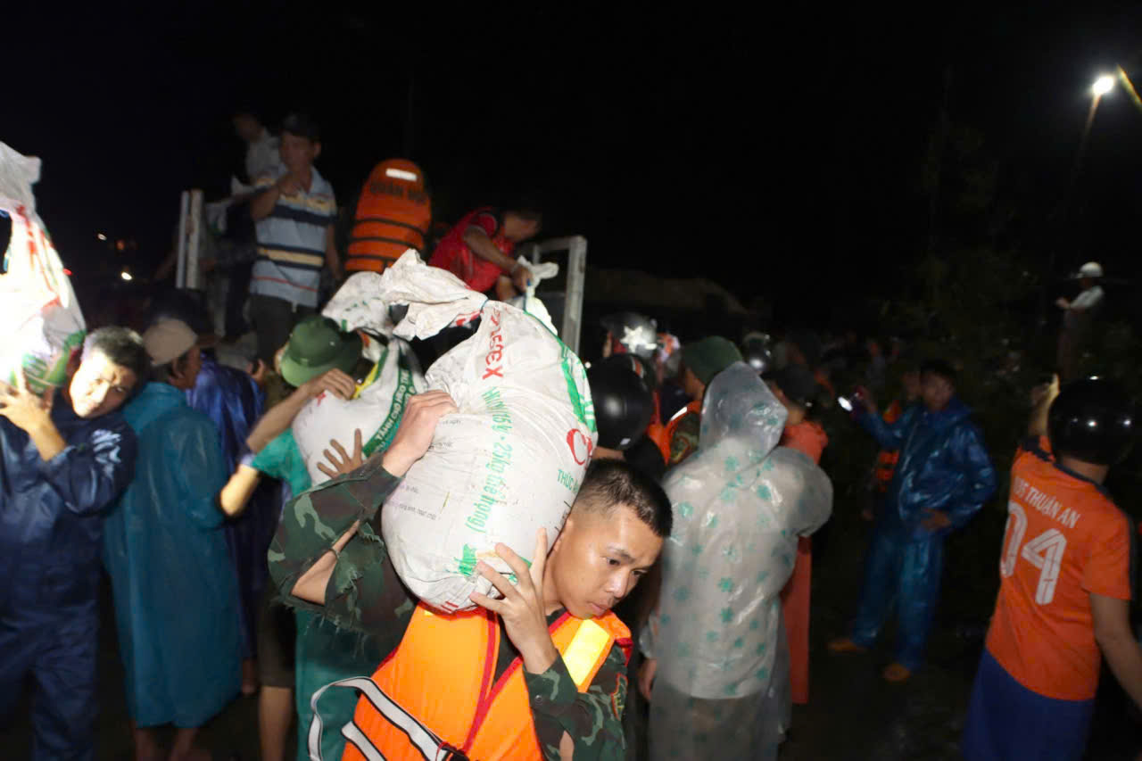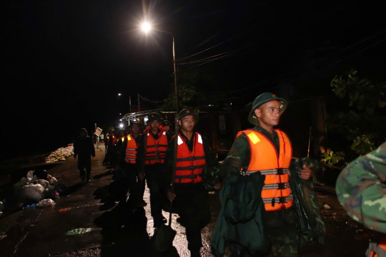 Do nền đất yếu, đường trơn trượt và mưa lớn kéo dài, các phương tiện cơ giới gần như không thể tiếp cận hiện trường. Nhiều đoạn phải hoàn toàn dựa vào sức người. Giữa gió lạnh và sóng biển đập dữ dội, những người lính vẫn kiên cường bám trụ, quần áo ướt sũng, chỉ kịp ăn vội bữa tối để tiếp tục nhiệm vụ.