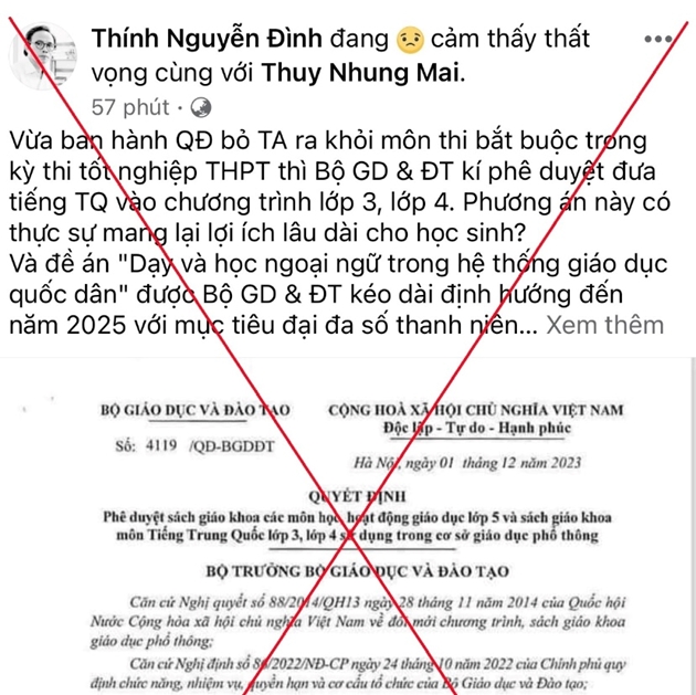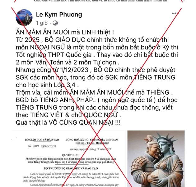 Đây là hoạt động bình thường, theo đúng kế hoạch thẩm định, phê duyệt danh mục sách giáo khoa các môn Ngoại ngữ trong Chương trình Giáo dục phổ thông 2018. Năm 2022, cùng với tiếng Anh, Bộ Giáo dục và Đào tạo đã phê duyệt sách giáo khoa tiếng Hàn, tiếng Nhật, tiếng Pháp lớp 3 để sử dụng trong các cơ sở giáo dục phổ thông. Năm 2023 đợt 1 sẽ phê duyệt các sách giáo khoa của lớp 5, trong đó có 10 bản sách tiếng Anh và các môn học khác cùng với tiếng Trung Quốc lớp 3, lớp 4. Dự kiến, trong tháng 12/2023, tiếp tục phê duyệt sách giáo khoa của các môn tiếng Hàn, tiếng Nhật, tiếng Pháp và tiếng Nga. Những hình ảnh xuyên tạc đang xuất hiện trên mạng xã hội. Ảnh chụp màn hình Tuy nhiên, sau khi quyết định trên được ban hành, trên mạng xã hội xuất hiện các thông tin xuyên tạc, bình luận tiêu cực, lệch lạc về nội dung quyết định. Điều này ảnh hưởng tiêu cực tới chủ trương đổi mới chương trình, sách giáo khoa; nỗ lực dạy và học môn Ngoại ngữ trong các trường phổ thông và gây tâm lý hoang mang trong xã hội.Bộ Giáo dục và Đào tạo đề nghị các cơ quan chức năng điều tra, xử lý những hành vi sai phạm trên theo đúng quy định của pháp luật.