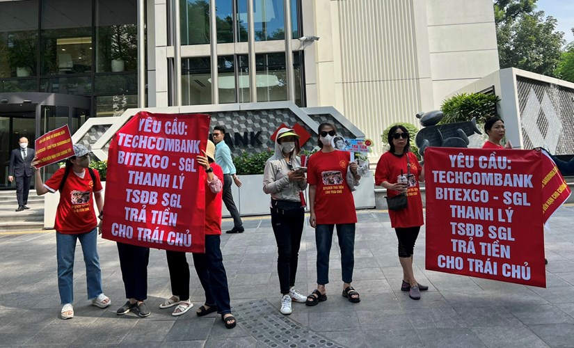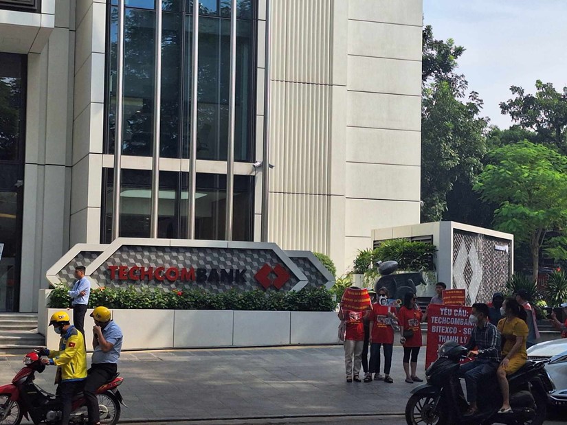 Nhóm trái chủ trước trụ sở Ngân hàng Techcombank