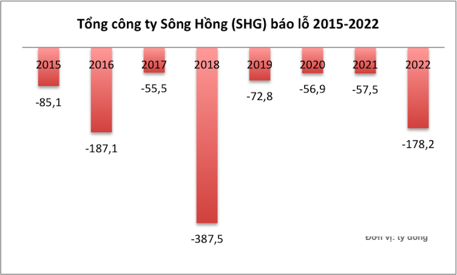 Trong vòng một thập kỷ qua, Tổng công ty Sông Hồng ghi nhận có tới 9 năm kinh doanh thua lỗ. Các khoản lỗ sau thuế từ năm 2015 đến năm 2022 lần lượt là số âm 85,1 tỷ đồng; -187,1 tỷ đồng; -55,5 tỷ đồng; -387,5 tỷ đồng; -72,8 tỷ đồng; -56,9 tỷ đồng; -57,5 tỷ đồng và -178,2 tỷ đồng.
