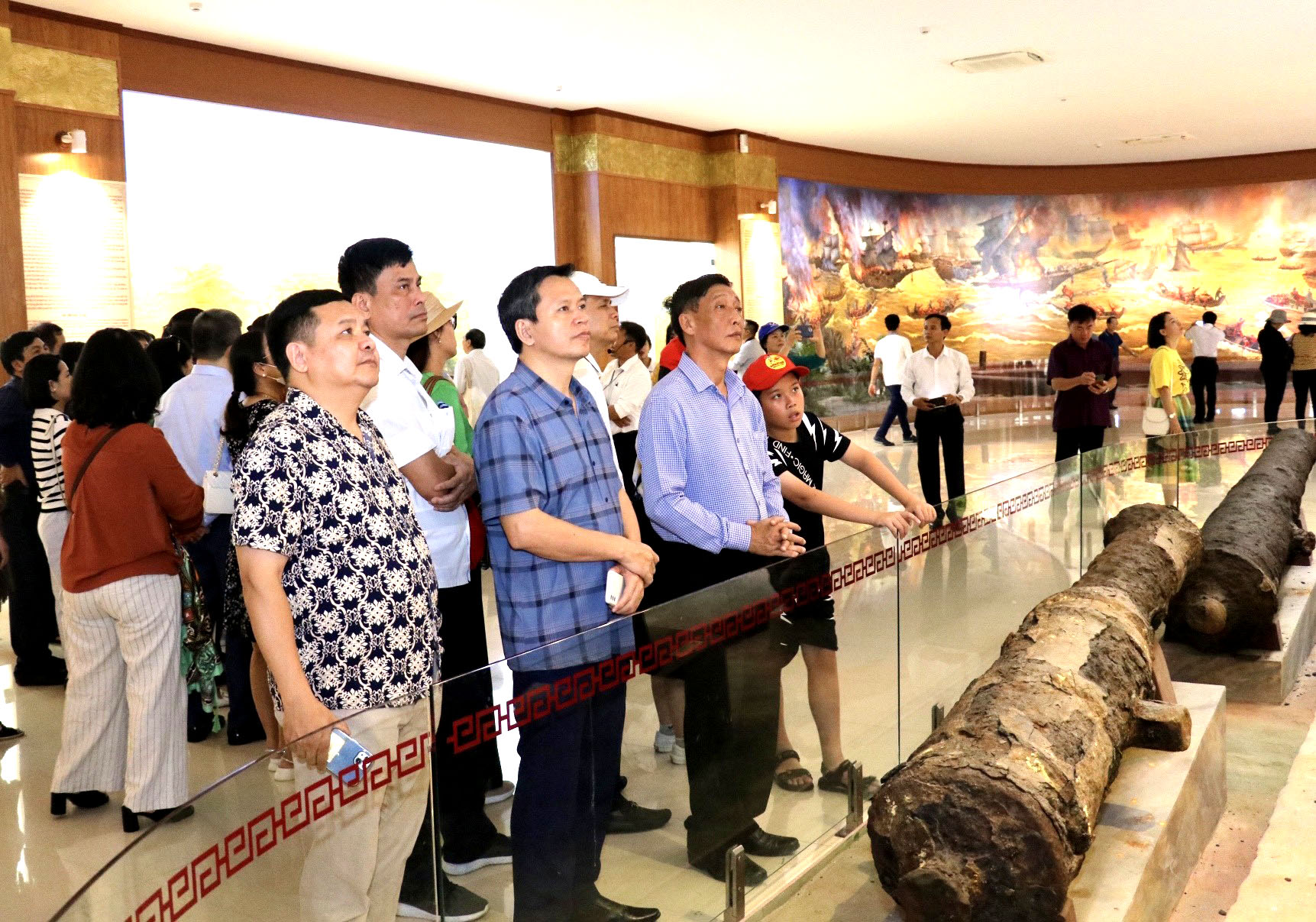 Các đại biểu chiêm ngưỡng những di vật thể về chiến tích lừng lẫy của phòng trào khởi nghĩa nông dân Tây Sơn cuối thế kỷ XVIII trưng bầy Nhà trưng bày ở Bảo tàng Quang Trung