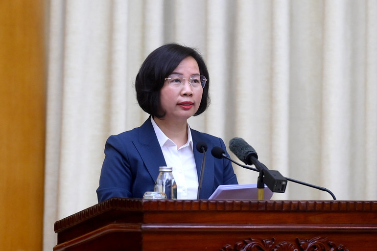 Đồng chí Bùi Huyền Mai, Chủ tịch Ủy ban Mặt trận Tổ quốc Việt Nam thành phố Hà Nội phát biểu tại hội nghị. (Ảnh: ĐĂNG KHOA)