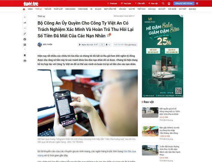 Dưới bài quảng cáo này là hình ảnh chụp màn hình một bài báo có tiêu đề: “Bộ Công an uỷ quyền cho Công ty Việt An có trách nhiệm xác minh và hoàn tiền thu hồi lại số tiền đã mất của các nạn nhân”.