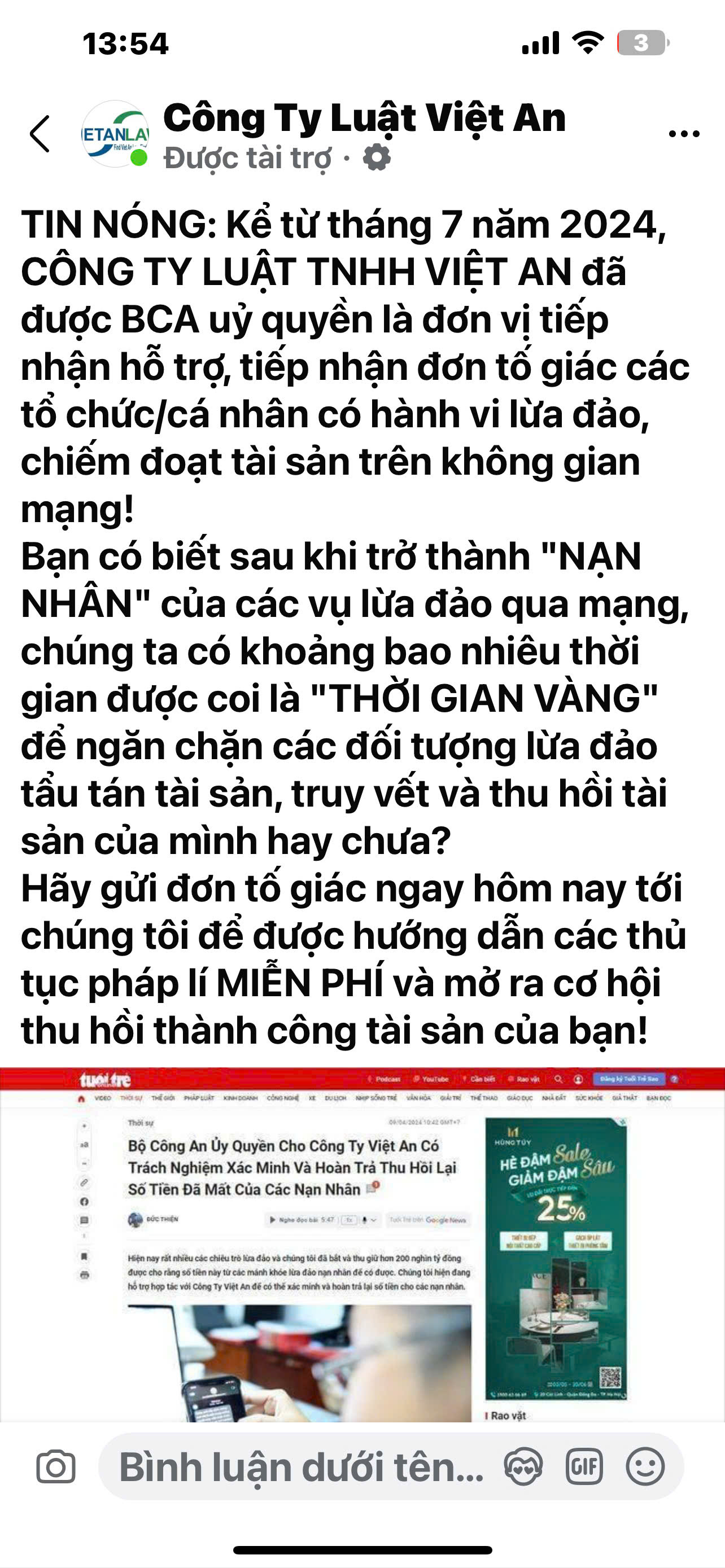Trong tháng 10/2024, khi “lướt” mạng xã hội Facebook anh thấy một bài quảng cáo của một trang Fanpage lấy tên là Công ty Luật Việt An. Bài quảng cáo này có nội dung: