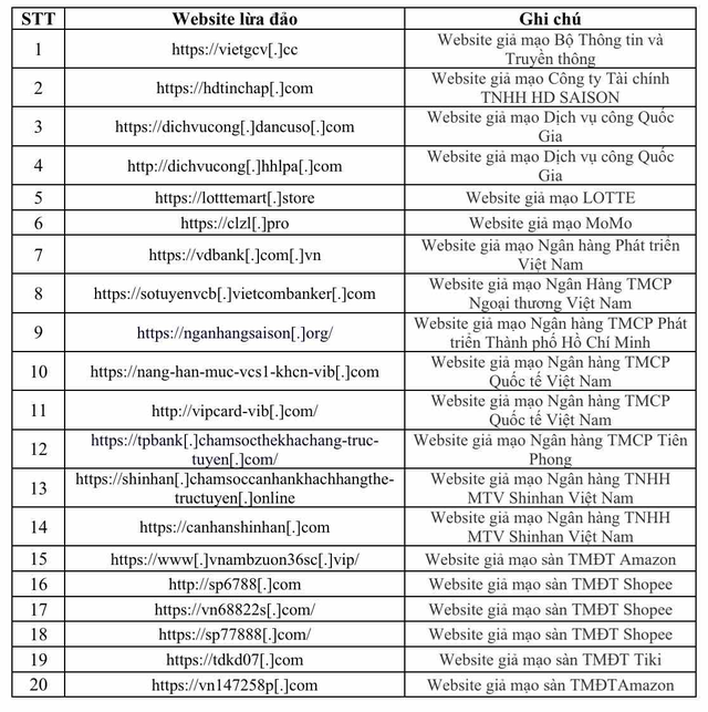 Một số website lừa đảo theo khuyến cáo của Cục An toàn thông tin, Bộ Thông tin và Truyền thông.