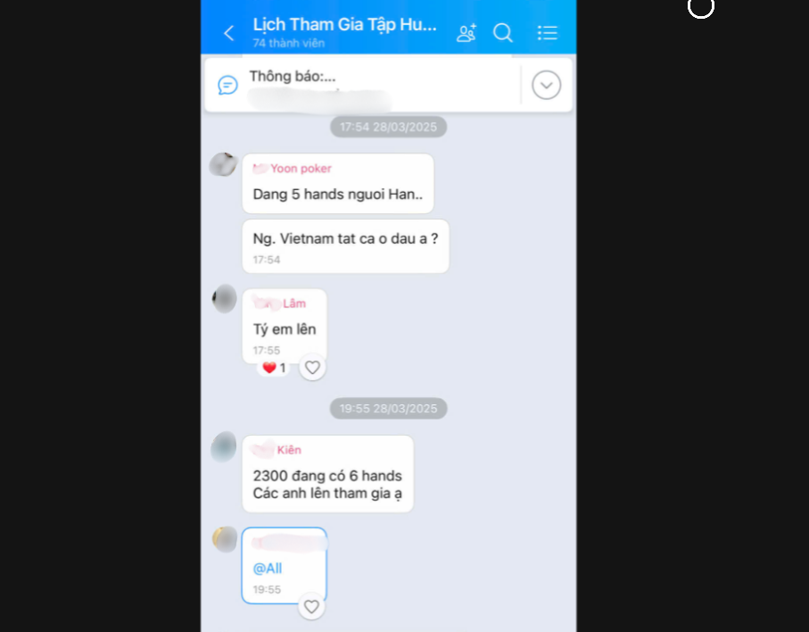Lấy ví dụ, trong một tin nhắn được một người đàn ông Hàn Quốc (được cho là nhà đầu tư của câu lạc bộ LEGEND) gửi trong nhóm “Lịch tham gia tập huấn Legend Poker Room” có đoạn: 2 người Hàn Mr Oh và Mr Jinsu đang lên. 2.3m 3.45 tất cả được.