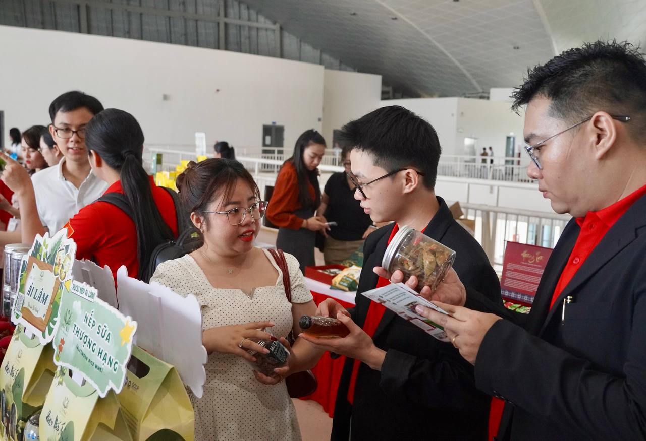 Cán bộ thu mua của Central Retail (bên phải) tìm hiểu sản phẩm của doanh nghiệp, Hợp tác xã trưng bày tại sự kiện.