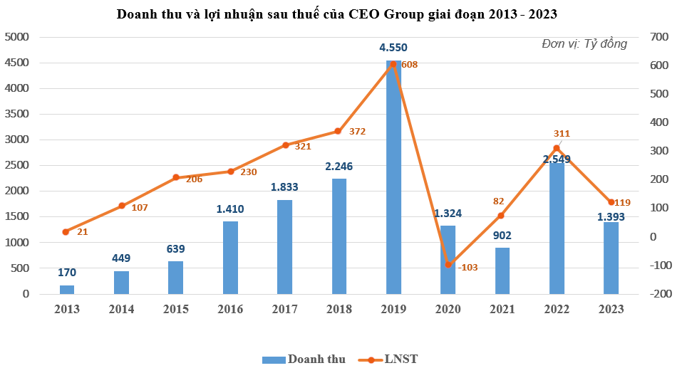 Nhìn lại kết quả kinh doanh 5 năm qua cho thấy, sau khi đạt đỉnh lợi nhuận 608 tỷ đồng vào năm 2019, CEO Group rơi vào tình cảnh khó khăn vì đại dịch kéo dài. Năm 2020, tập đoàn bất ngờ báo lỗ hơn 103 tỷ đồng. Trong năm 2021, lợi nhuận sau thuế đạt mức thấp 82 tỷ đồng và hồi phục tăng lên 310,6 tỷ đồng trong năm 2022.