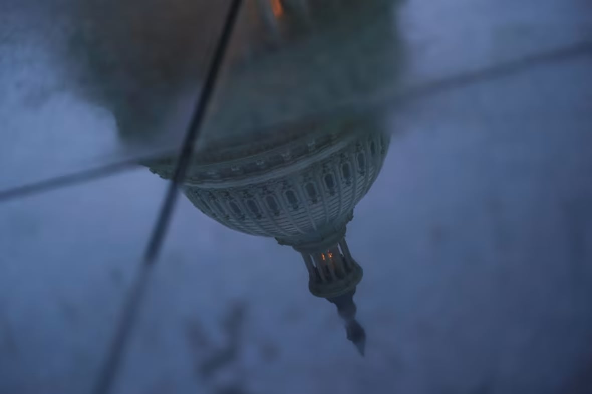 Mái vòm của Điện Capitol Hoa Kỳ phản chiếu trên vũng nước trên mặt đất vào ngày 29 tháng 9 năm 2025. (Ảnh: Nathan Howard/Reuters)