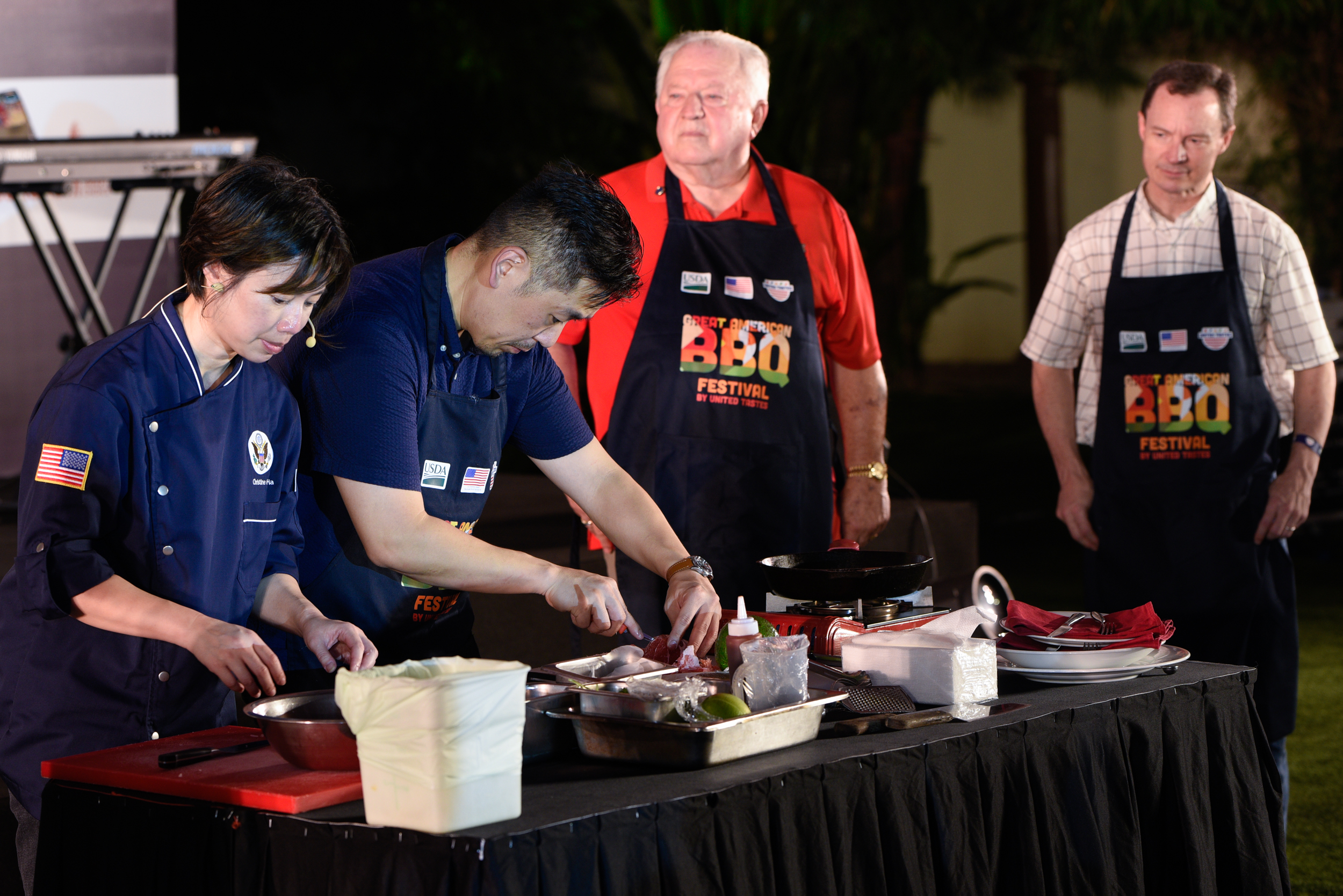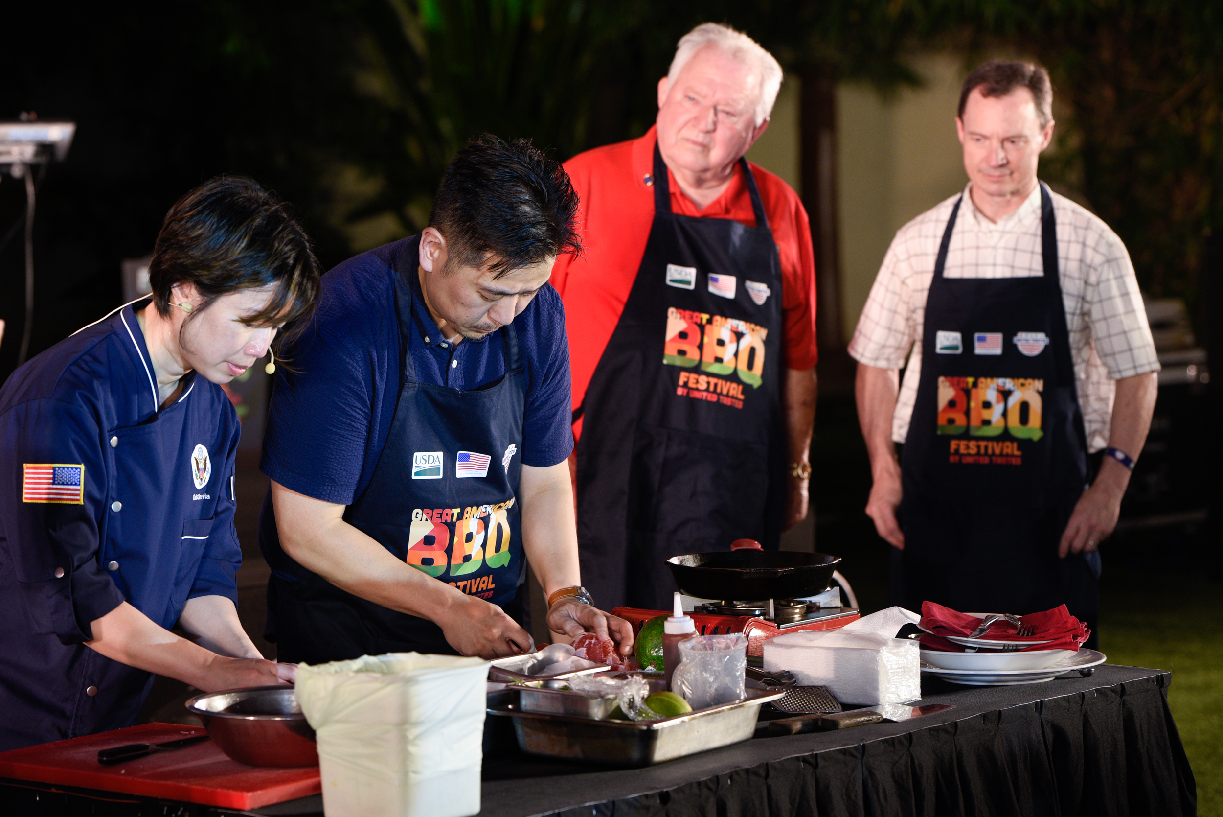 Khách mời đã có cơ hội thưởng thức tiệc nướng kiểu Mỹ với 20 món đa dạng được làm từ 28 nguyên liệu Mỹ bao gồm thịt heo, gà, khoai tây, phô-mai California, táo Washington, việt quất, nho khô, sâm Wisconsin, đậu phụ tươi và dầu ăn làm từ đậu nành Hoa Kỳ; thịt bò, rượu rum, bưởi, ngũ cốc cao lương, bột mỳ cao lương không gluten và sốt BBQ từ bang Texas. Thực đơn bữa tối tự chọn được thiết kế riêng và do các đầu bếp từ nhà hàng Moose and Roo Smokehouse chuẩn bị.
