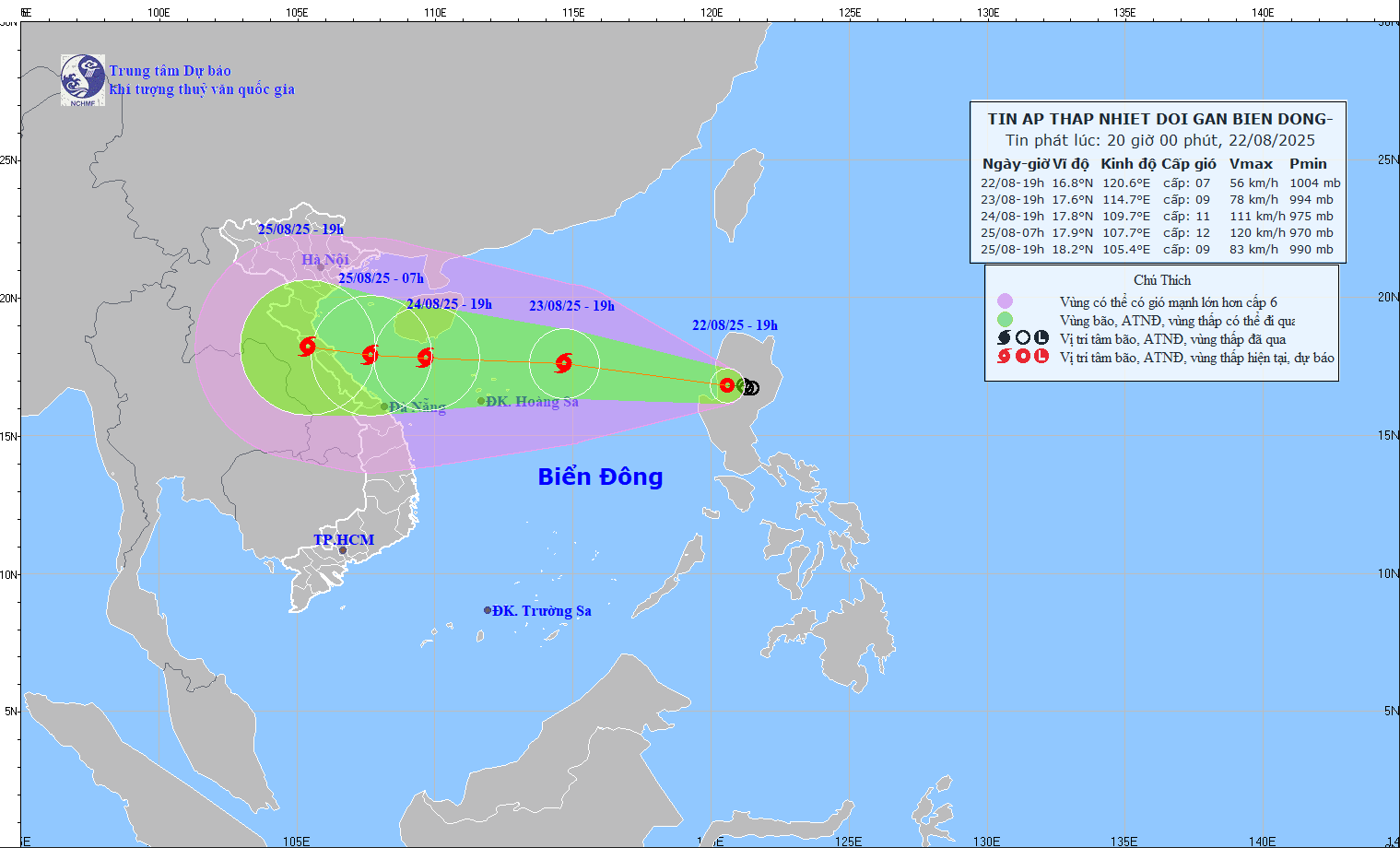 Theo Trung tâm dự báo khí tượng thủy văn quốc gia, áp thấp nhiệt đới di chuyển nhanh, nhiều khả năng mạnh lên thành bão số 5 vào đêm 22/8, sau đó tiến vào Biển Đông với tốc độ khoảng 20 km/giờ. Dự báo đến ngày 24/8, khi di chuyển tới khu vực quần đảo Hoàng Sa, bão có thể đạt cấp 10-11, giật cấp 13-14, tiếp tục mạnh thêm và dự kiến đổ bộ đất liền Trung Bộ nước ta ngày 25/8.