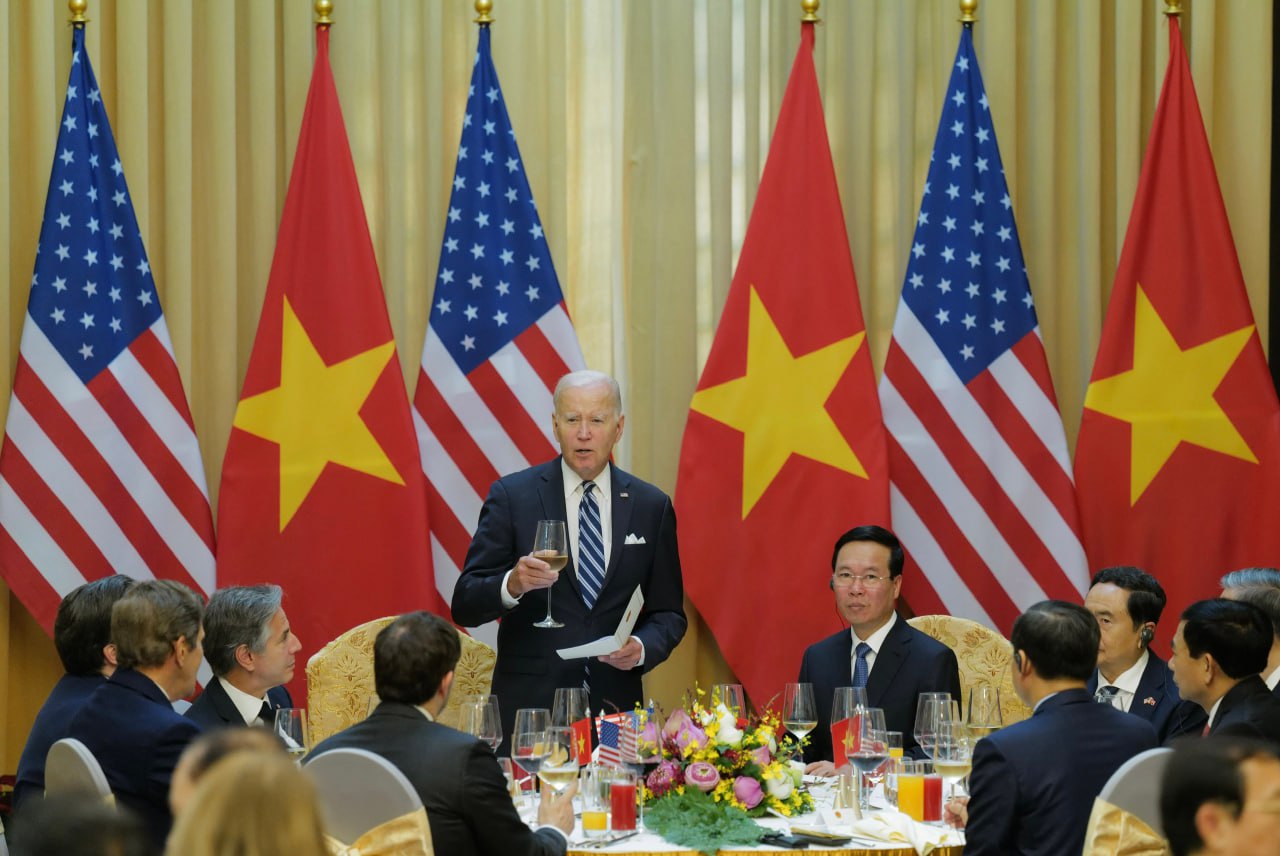 Tổng thống Joe Biden phát biểu trong tiệc chiêu đãi tổ chức tại Trung tâm hội nghị quốc tế ở Hà Nội (Ảnh: Pool)