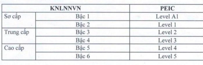 Các cấp độ của chứng chỉ tiếng Anh PEIC được Bộ Giáo dục và Đào tạo công nhận tương đương với 6 bậc của Khung năng lực ngoại ngữ 6 bậc dùng cho Việt Nam