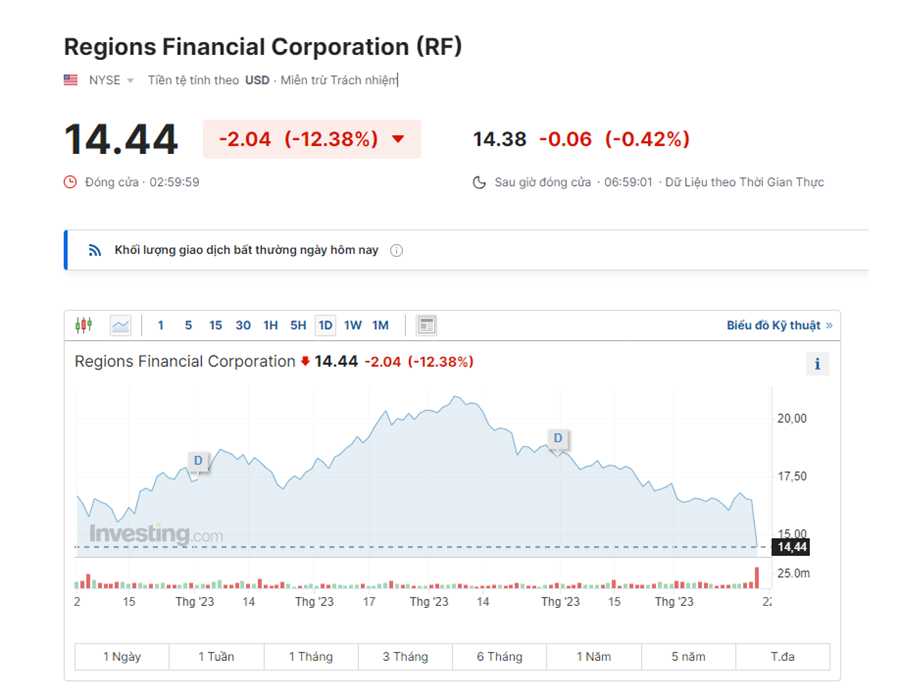 Cổ phiếu RF của Regions Financial giảm mạnh 12,38% do báo cáo lợi nhuận thấp hơn dự kiến.