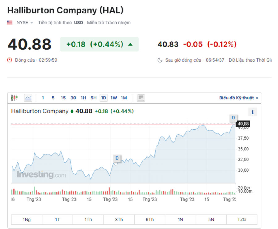 Cổ phiếu của Halliburton tăng 0,44% lên 40.88 USD/CP và duy trì đà tăng hơn 40,9% trong vòng 3 tháng qua