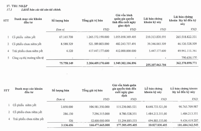 Cụ thể, tự doanh đã bán khoảng 67,2 triệu cổ phiếu niêm yết trị giá 1.265 tỷ đồng trong quý 3, tạo ra khoản lãi 210 tỷ đồng. Quyết định bán 8,5 triệu cổ phiếu chưa niêm yết mang lại cho công ty khoản lãi 39,3 tỷ đồng. Quý trước, công ty đã cắt lỗ hơn 10 tỷ đồng đối với một lượng cổ phiếu có giá trị đầu tư ban đầu khoảng 124 tỷ đồng.