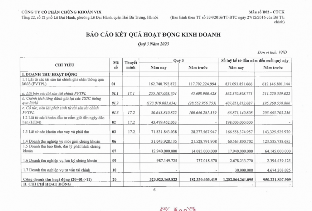 Cụ thể, trong quý 3, doanh thu hoạt động của VIX tăng tới 77% so với cùng kỳ năm 2022, đạt 323 tỷ đồng. Đóng góp chủ yếu là các khoản lãi từ tài sản tài chính (162,7 tỷ đồng), lãi các khoản đầu tư (30,6 tỷ đồng), lãi từ cho vay (72 tỷ đồng), doanh thu môi giới chứng khoán (31 tỷ đồng)…