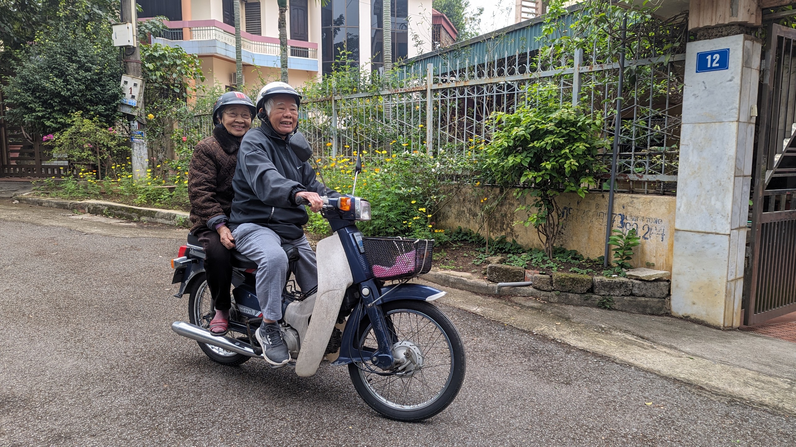Sáng sáng, người dân thị trấn Hùng Sơn (Lâm Thao, Phú Thọ) rất quen thuộc trước hình ảnh một cặp vợ chồng lão ông, lão bà chở nhau trên chiếc xe Cup 82 đi ăn sáng, uống cà phê trước khi về làm bạn với sân vườn.