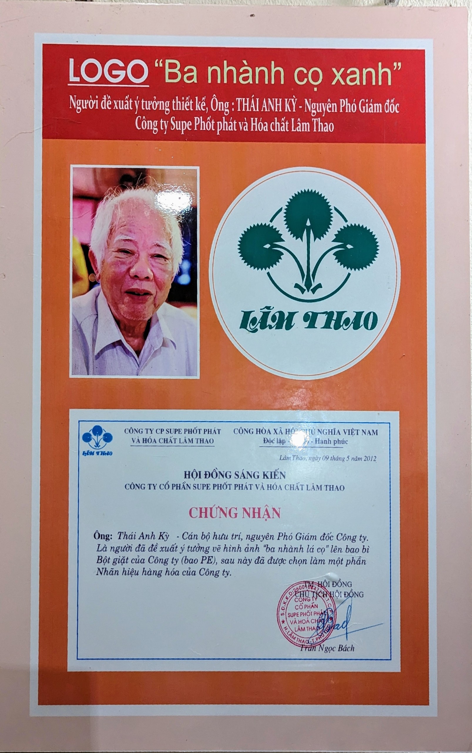 Thăm nhà ông Thái Anh Kỳ chúng tôi mới biết ông Kỳ chính là người đề xuất ý tưởng hình ảnh “Ba nhành cọ” làm nhãn hiệu hàng hóa của Công ty Supe Lâm Thao.