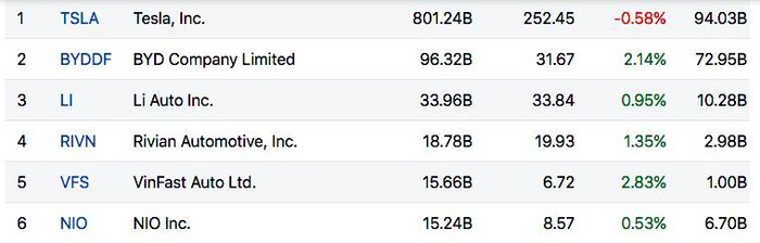 Nếu xếp theo xe thuần điện, VinFast Auto tiếp tục ở vị trí thứ 4, dưới Tesla, Rivian của Mỹ, Li Auto của Trung Quốc và xếp trên một số hãng xe điện nhỏ.