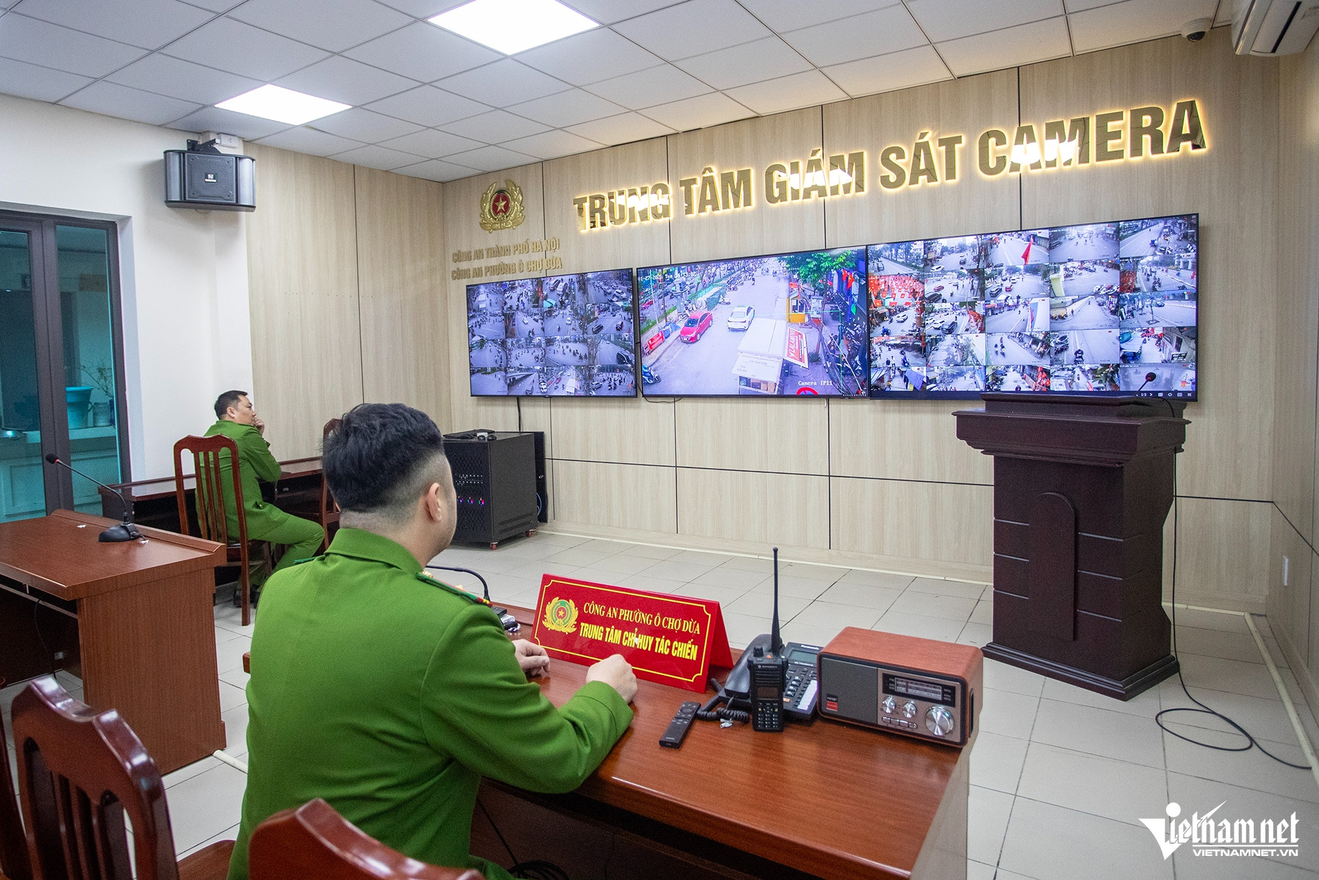 Tại Trung tâm giám sát camera an ninh trật tự của Công an phường Ô Chợ Dừa (Hà Nội), các cán bộ, chiến sĩ thường trực 24/24h bên hệ thống màn hình để theo dõi, bao quát tình hình an ninh trật tự trên địa bàn. (Ảnh: Vietnamnet.vn)