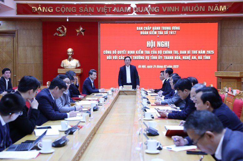 TCVM - Chiều 24/2, đã diễn ra Hội nghị bố quyết định kiểm tra của Bộ Chính trị, Ban Bí thư năm 2025 đối với các Ban thường vụ tỉnh uỷ: Thanh Hoá, Nghệ An, Hà Tĩnh.