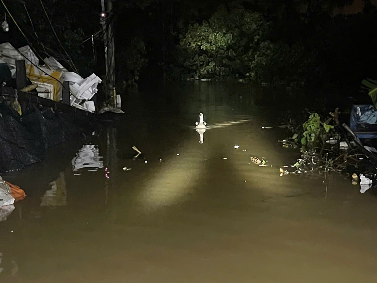 Một con ngỗng bị lạc dựa theo ánh sáng đèn của người dân bơi vào bờ